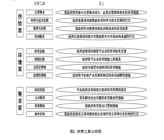图1所示的是政策工具对产业创新的影响,图2则将具体的政策工具及其含义呈现了出来,主要由供给面、环境面与需求面三个大面及公营事业、科学与技术发展等十二类小项构成。供给面政策工具指政府围绕创新主体及人才、资金、技术、知识、信息等要素,运用各类政策工具,直接进行创新供给,引导和改善创新要素供给状况,以推动创新的一系列政策。主要包括公营事业、科学与技术发展、教育与训练及咨询服务四项。环境面政策工具指政府通过制定创新战略与规划、激励创新的制度设计等,从创新的环境要素间接影响科技创新活动,从而达到促进产业创新的一系列政策。主要分为财务金融、租税优惠、法规及管制和政策性策略。需求面政策工具指政府为减少市场不确定性,引导创新方向,通过政策设计来创造出国内外市场对产业创新的需求,进而拉动科技创新的一系列政策。主要由政府采购、公共服务、贸易管制与海外机构组成。