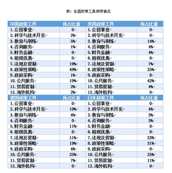 表1较为直观且具体地显示出了各个国家的政策工具使用情况;图3则将四个国家的政策工具使用情况放在了一起进行比较,较为清晰地展现出了中美德日在政策工具选择上的差异。总体而言,四个国家政策工具的使用情况虽然整体上存在差异,但是具体分析可以发现存在许多相似之处,如在环境面政策工具上,每个国家都侧重于“法规与管制”及“政策性策略”政策工具的使用。