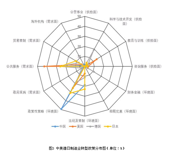 在制造业转型政策的制定上,我国虽然在供给面、环境面、需求面的政策工具上都有所涉及,但过于仰仗环境面政策工具,对其他两类政策工具有所忽视,政策结构也有所失衡。整体上看,我国与其他国家在政策工具的使用上存在着明显的差异,但是也不乏相似之处。如在需求面中,我国与其他各国都倾向于“公共服务”类政策工具的使用,但这仅仅是数量上的相似。美国与德国在“公共政策”中主要以建设创新及转型升级所需的公共基础设施、创新平台、创新网络,和加强科普、科学的传播,以转变公民对制造业的认识,确保及发动公众参与到新一轮的科技创新发展过程当中为主要内容;日本则更注重于科技成果转化、科技成果产业化及科技成果服务于民众等方面,可见日本不仅重视知识产权的保护与发展,而且对知识产权成果后续的处置问题也有较强的政策保障,这既能够激发公众对于创新的热情,同时也在一定程度上降低了公众对于创新收益的后顾之忧,极大的促进了国内科技创新的产生。我国在“公共服务”上主要以政策的制定与完善和体制机制改革为主要内容,相较于其他国家政策的力度显然是不足的。基于以上研究,得出以下三点启示:
