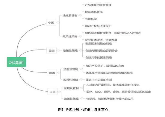 从图5中可以看出,美国环境面注重政策性策略的使用,其中以制定国家制造业战略为主要导向,为国家制造业的发展指明了具体的方向。又以创建先进制造业咨询协会、共享的国家网络等具体措施改善国内制造业发展的环境,拉动国内制造业创新。