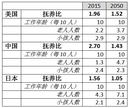 1、目前世界最大的三个经济体,所面临的生产和消费的基本格局将来又是如何的呢?看一看关键的比例,“抚养比”——工作年龄人数(16-65岁)与被抚养人数(老人(>65岁)+小孩(<16岁)之比。中国社会的老龄化是扑面而来,并将长久与我们同在。