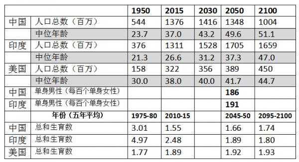2、目前世界三个人口最多的国家,所面临的人口长期变化——规模和构成的趋势又怎样?请看以下的一些数字。
