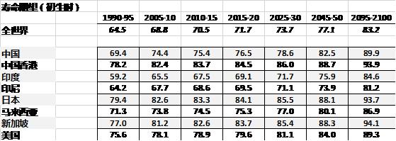 过去的20年间(1990-95到2010-15),中国人口的平均寿命增加了6岁,日本人口的平均寿命增加了3.9岁,美国的则增加了3.3岁;今后的15年即一代不到的时间里,中国人口的平均寿命将再延长3.2岁,日本的将再延长2.2岁,而美国的则会再延长2.2年。展望再下一代的20年(从2030到2050),中国人口的平均寿命将再延长6年,日本人和美国人将分别再延长4年和4.4年。