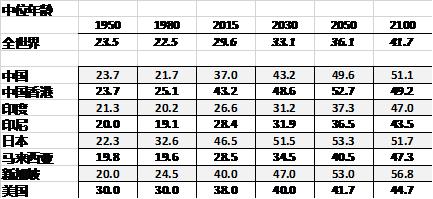 上文已有提到,拜社会保障制度和医疗健保技术的进步之赐,人类的健康状况大有改善,更长更健康的退休生涯已然成为全球常见的现象。直到一、两代人之前,退休还是一个闻所未闻的字眼,活到老做到老是大多数人的宿命,除了极少数上层人士之外。从下表摘引的寿命期望岁数和中位年龄的数据,我们可以清楚看出。